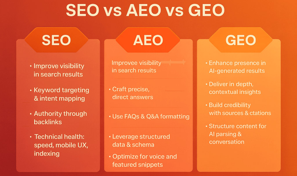 - Bottom line → SEO = rankings, AEO = instant answers, GEO = AI-era visibility. Together, they maximize reach, trust, and growth in 2025 and beyond.